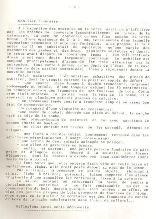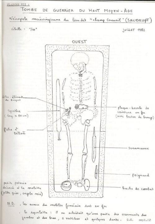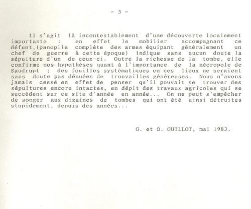 Un siècle plus tard, en 1882, Messieurs Guillot, père et fils, dont nous vous avons fait connaître les travaux l’année passée sur ce blog, découvrent la sépulture d’un chef de guerre de l’époque du Haut Moyen Age. En voici le compte-rendu précis qu’ils en font :