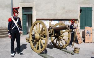 Le canon de la bataille d’Austerlitz (Napoléon), encadré par les deux servants en tenue d’Empire.