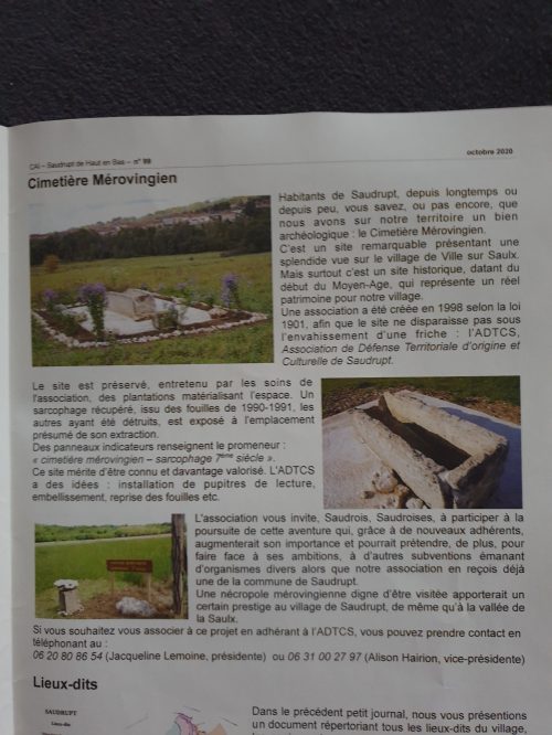 Rappelons que l’association ADTCS a été fondée il y a 22 ans en plein remous du remembrement, afin de défendre ,au mieux, le patrimoine du village ainsi que ses habitants les plus malmenés, puis de façon plus ciblée le cimetière mérovingien qui allait tomber dans l’oubli.